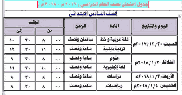 جدول امتحانات نصف العام 2017 للمرحلة الابتدائية