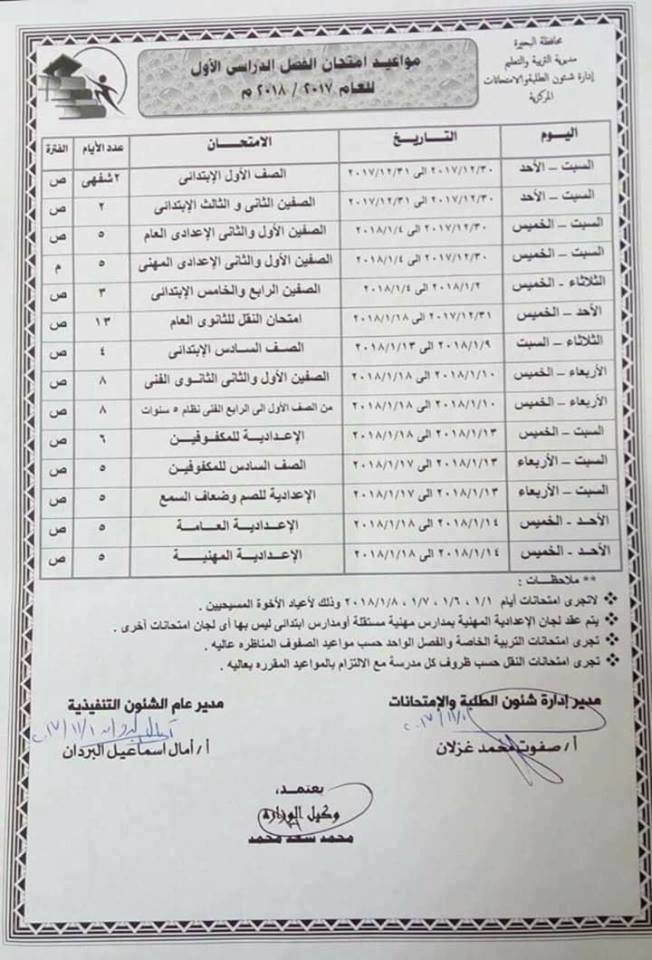 جدول امتحانات نصف العام 2019 كل المحافظات. جدول امتحانات نصف العام 2018 محافظة القليوبية جميع المراحل التعليمية يشمل جدول امتحانات نصف العام للمرحلة الإبتدائية جدول امتحانات الترم الأول للإعدادية مواعيد امتحانات نصف العام للثانوية العامة. جدول امتحانات النقل للمرحلة الابتدائية. تبدأ امتحانات الصف الاول والثانى الاعدادى العام من يوم 30ديسمبر 2017 وحتى 4 يناير 2018.