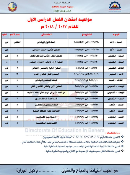 جدول مواعيد امتحانات الفصل الدراسي الاول 2019 2018 محافظة البحيره إبتدائى إعدادى ثانوى